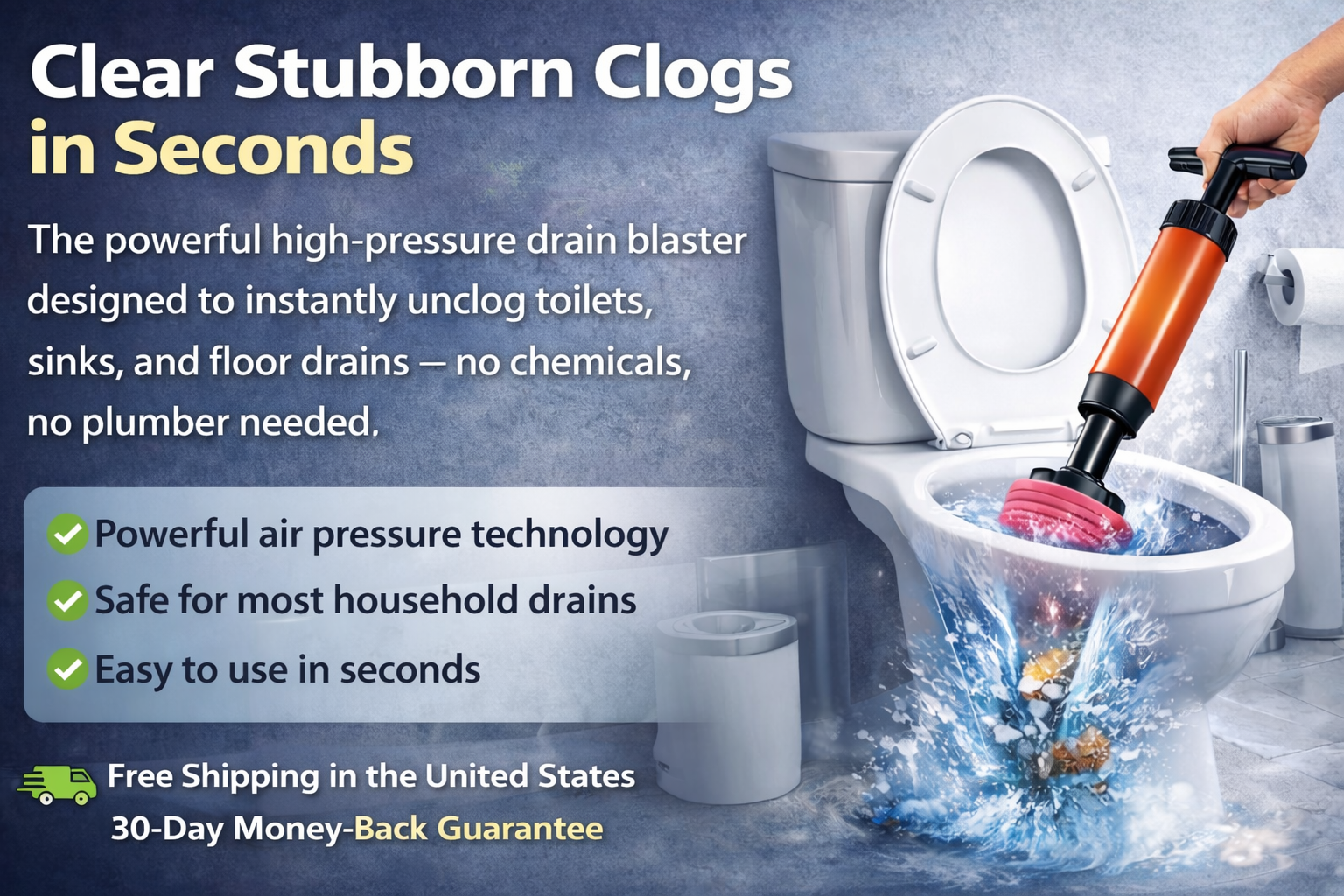 Advanced air pressure technology that breaks through tough clogs in seconds.